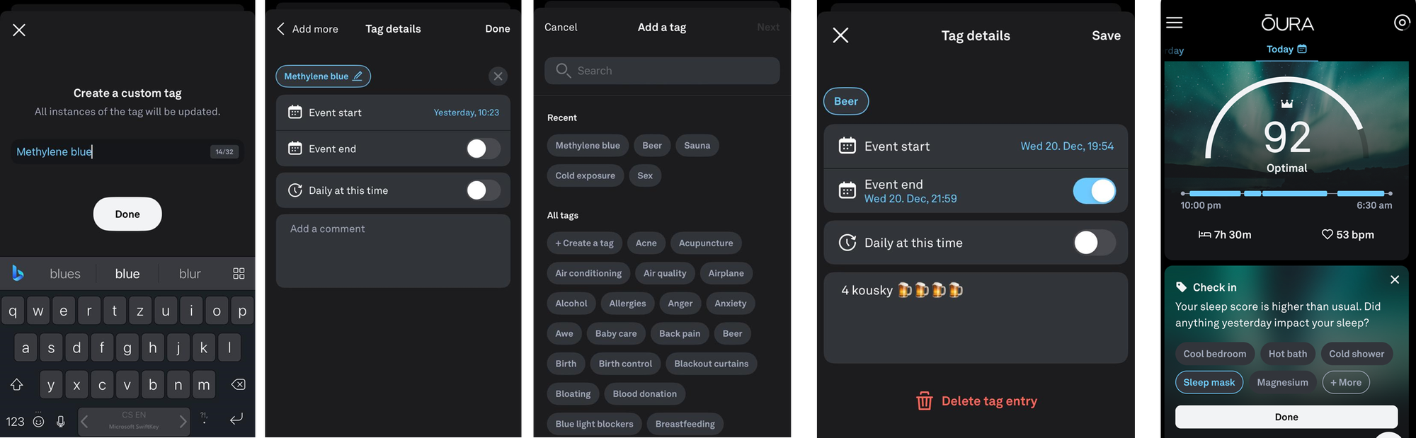 Konečně Oura umožní používat svoje custom (=vlastní) tagy, které se pak můžete využívat uplně stejně, jako ty standardní. Navíc je možné tagy časově ohraničit, nastavit denní opakování a přidat poznámku. Dále jsou tu nové Smart tagy, ty jsou navrhovány automaticky v případě značně zvýšeného / sníženého Sleep Score: