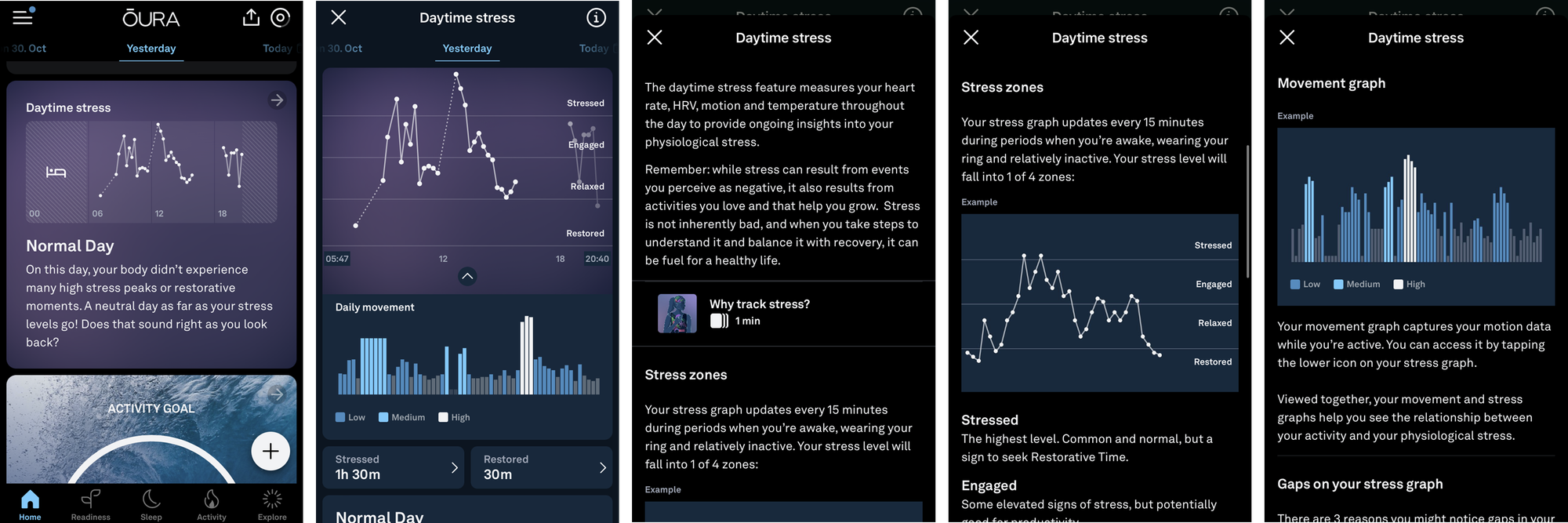 Oura používá ke kalkulaci stresu tyto metriky: HR, HRV, pohyb a teplotu. Výpočet stresu probíhá, když jste vzhůru a nesportujete. Záznam probíhá to každých 15 minut.