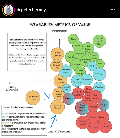 Osobně si tedy tak myslím, že Oura zejména dohání trend konkurentů a poptávku. A musím souhlasit s názorem @drpetertierney, který krásně vizualizoval, že Stres není metrikou, které byste měli dávat v rámci wearables větší význam (a navíc je obtížně měřitelná):