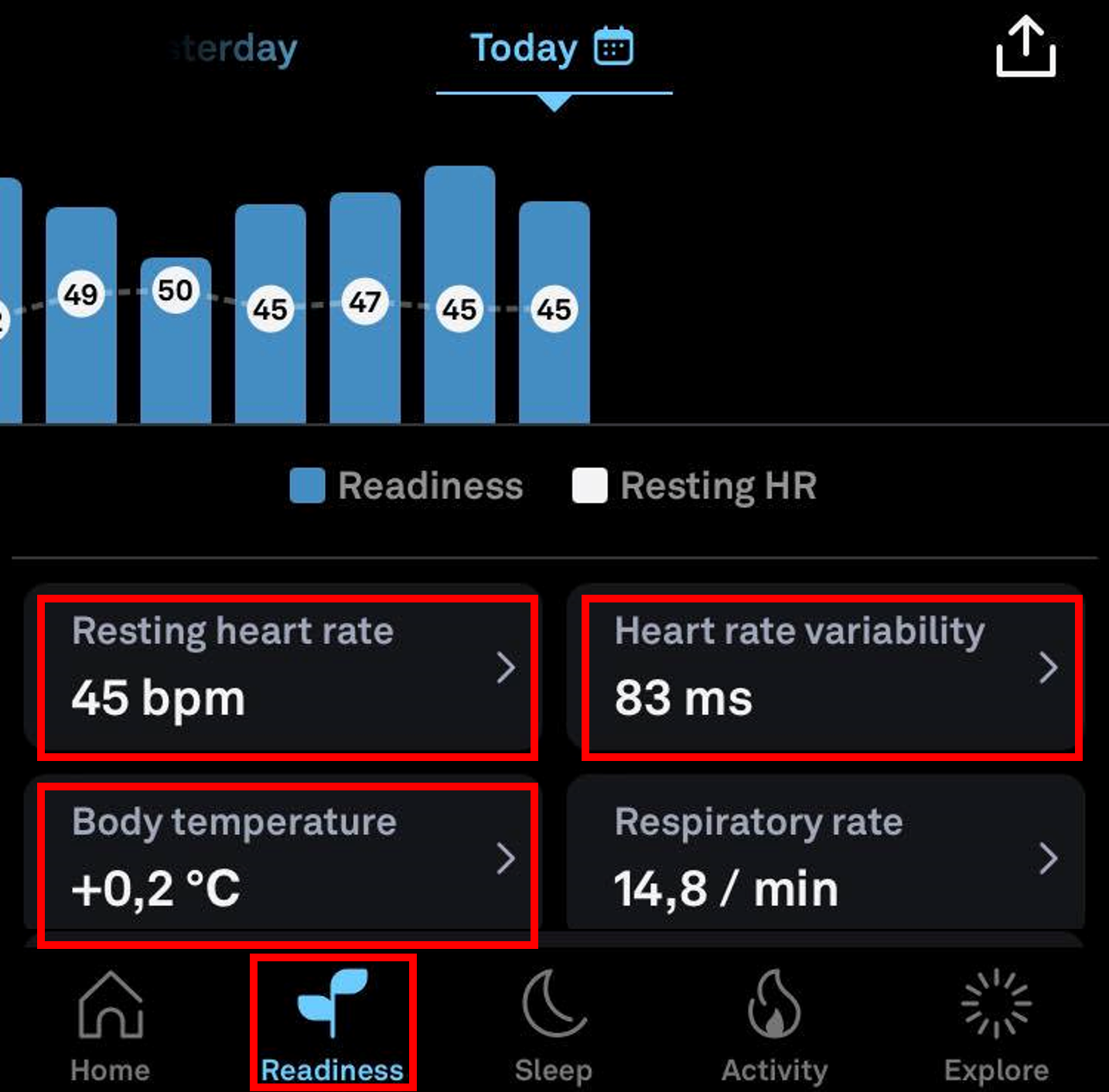 - Metriky hodné sledování - Readiness, HRV, teplota, RHR