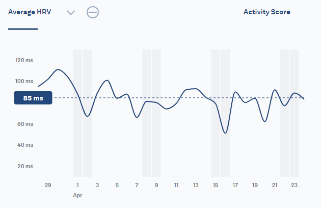 Co se HRV týče, můj přístup je celkem prostý, znám svou aktuální baseline (průměrnou hodnotu) a dívám se, zda jsem nad/pod ní pro přechozí noc. Pokud nad, je to pro mě vyloženě dobré znamení, pokud pod, uvažuji proč a zda bych si neměl dát tzv. voraz.
