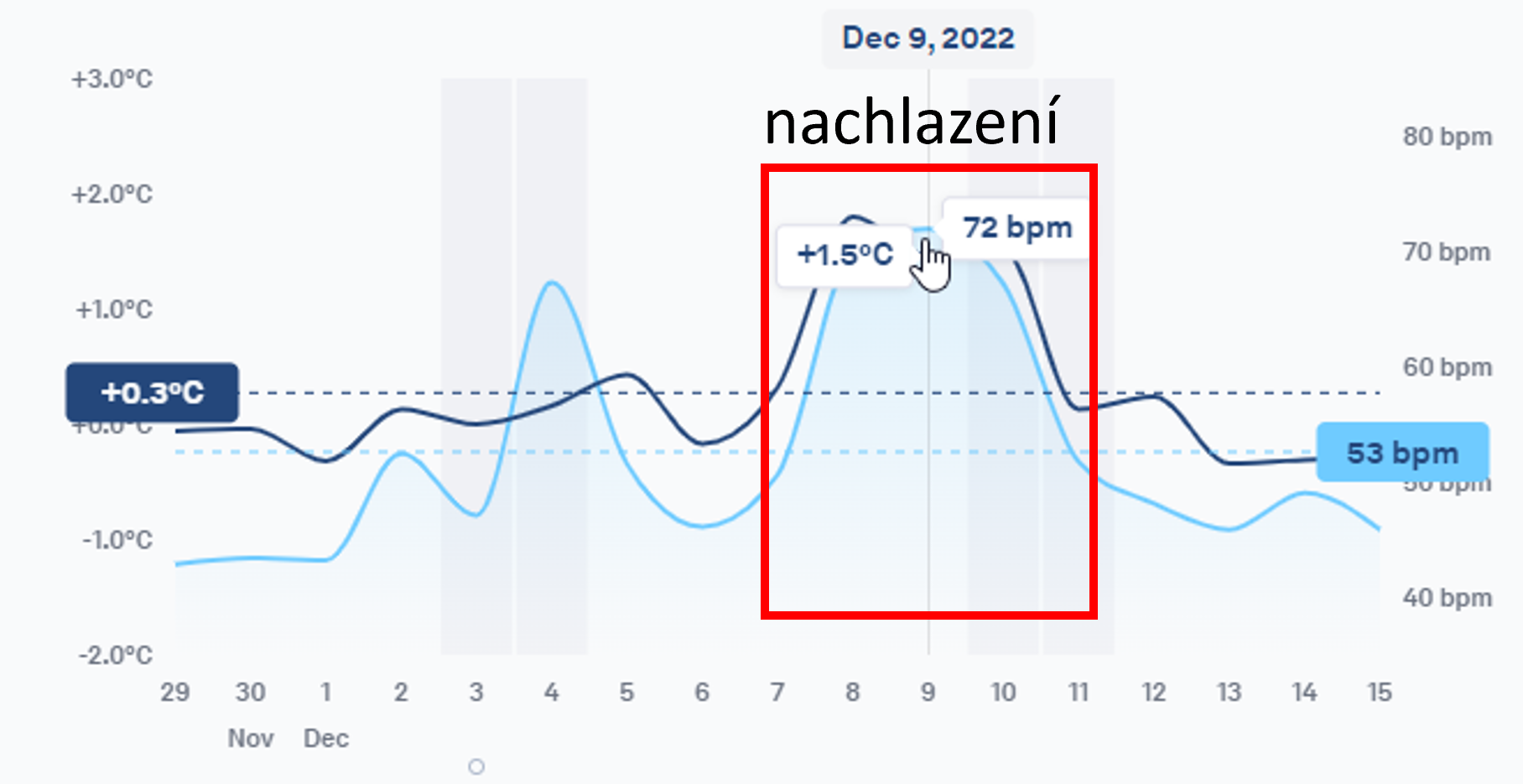 Teplotu a RHR používám mj. jako doplněk k vlastní úvaze o připravenosti na daný den (zejména co se fyzických aktivit týče), tedy podobně jako u HRV. Dále pak jsou tyto 2 metriky užitečné ve fázi při nadcházejícím a odcházejícím onemocnění. Tedy jde o brzkou rekognoskaci toho, že "na mě něco leze", a v druhém případě, že jsou tyto hodnoty opět v normálu a já se mohu vrátit do tréninku, viz příklad proběhlého nachlazení ve veličinách teplota a RHR: