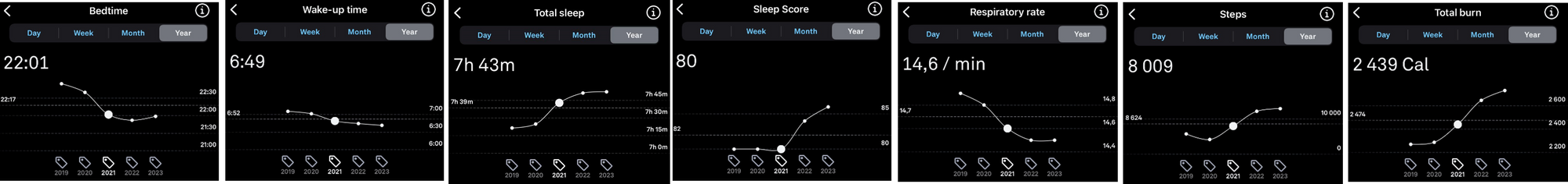 Osobně mám rád odzoomovat na max, tedy na měsíce a roky, z mé pětiletky používání Oury bych zhodnotil tedy např. toto: