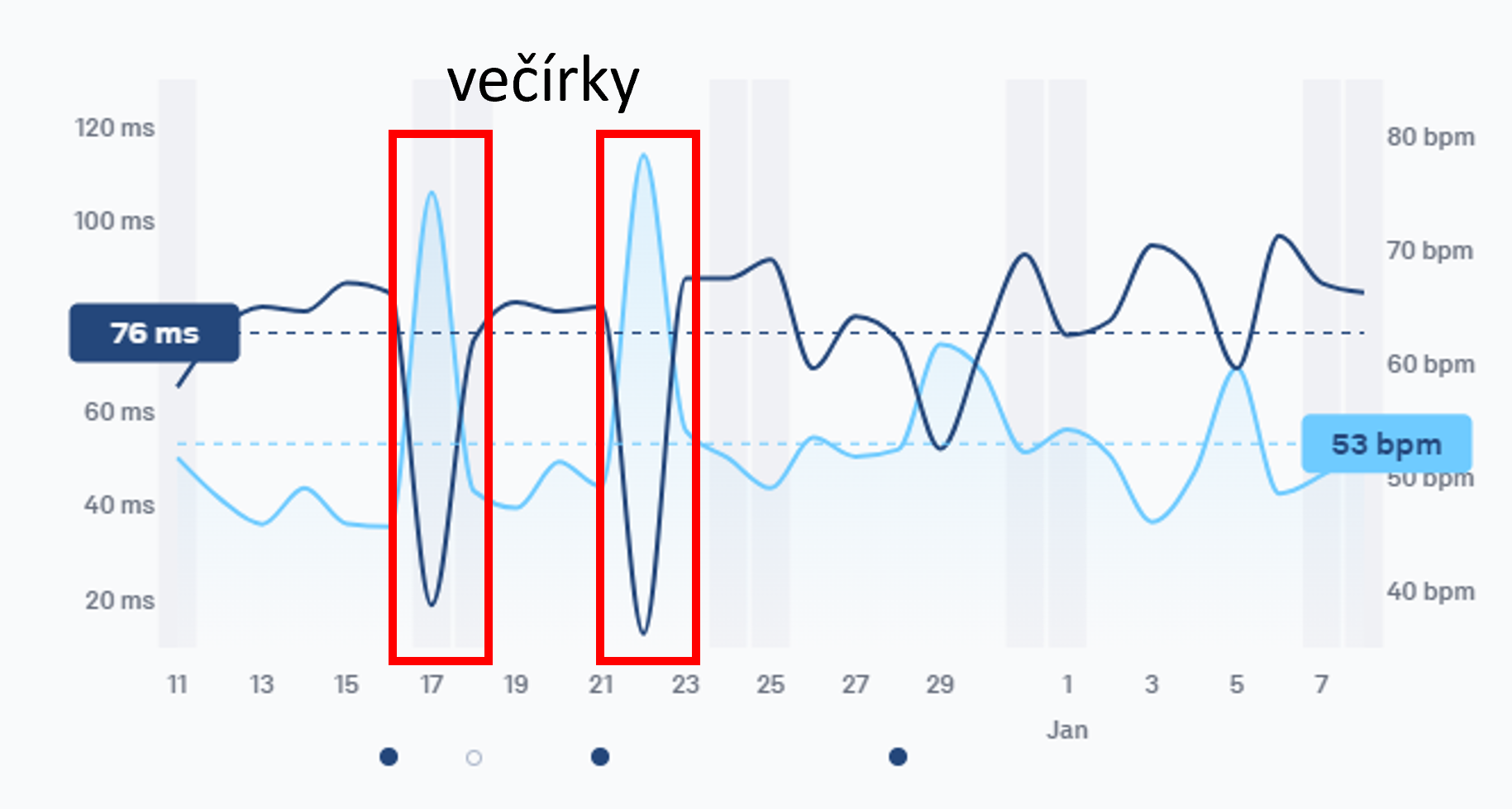 Mimochodem, v daném období by graf mé konzumace alkoholu měl určitě sestupnou tendenci a přispívá k tomu také do jisté míry Oura a její AHA efekt alkoholu na tělo, krásnou ilustrací jsou například dva alkoholové vánoční večírky, které spolehlivě vystřelí RHR a sestřelí HRV, což jasně hovoří o zátěži organismu: