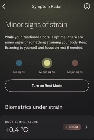 Symptom Radar sleduje změny ve více než 40 biometrických údajích. Zaměřuje se na teplotu kůže, dechovou frekvenci, RHR, HRV atd. Algoritmus klasifikuje podezření na tři úrovně: No signs, Minor signs a Major signs.