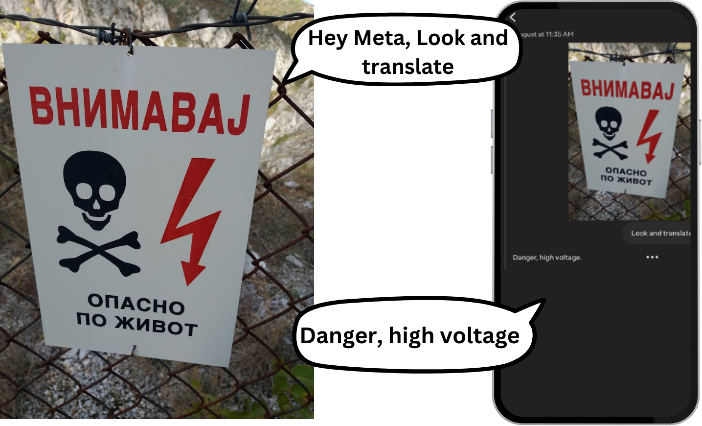 Anebo, řeknu "Hey Meta, Look and translate". A brýle vyfotí, co vidím, AI rekognoskuje text a hlasem vám odpoví. Komunikaci lze následně dohledat v aplikaci: