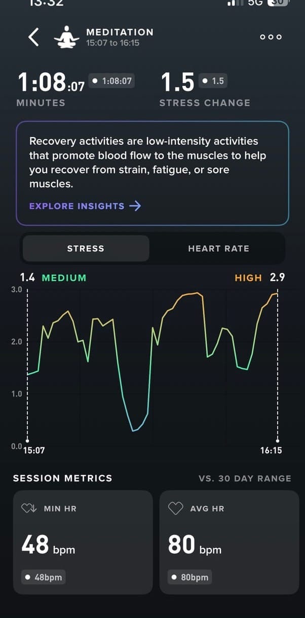 - Stres? Jak jsme si řekli, ruku v ruce s rostoucím HR klesá HRV, což Garmin interpretuje jako Stres. To může být, jak jsem zmínil, matoucí výsledek pro Garmin Inteligence, meditace by neměla přinášet stres :)
