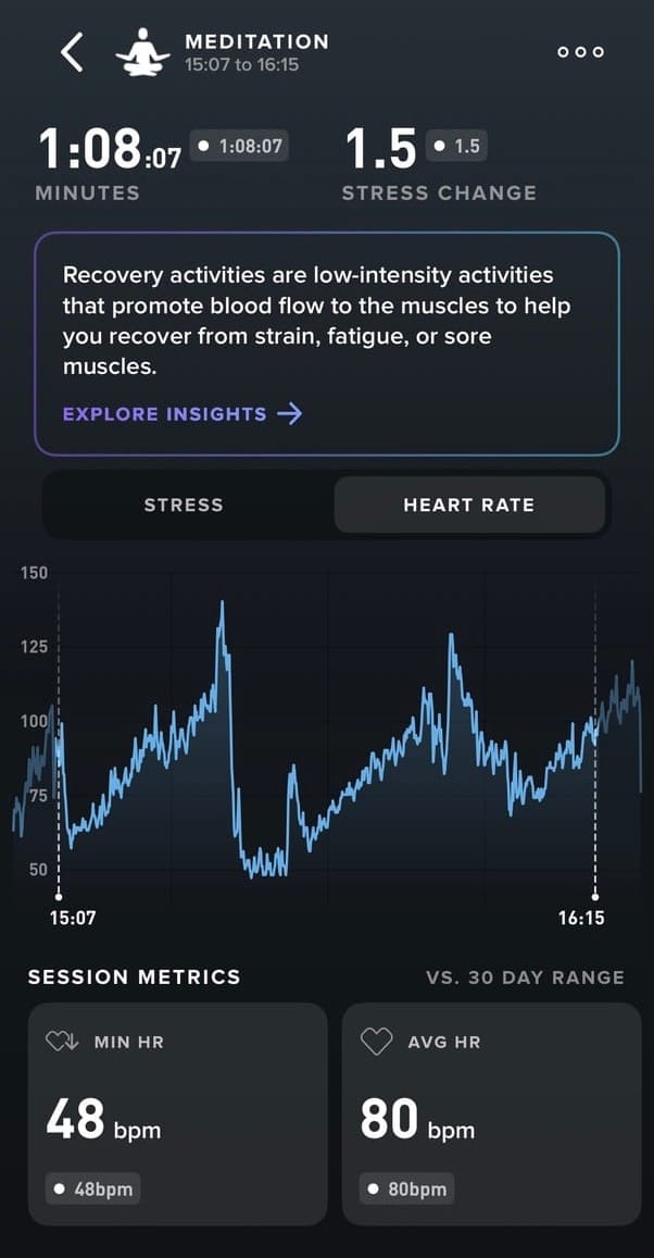 Z Garminu se mi do Whoop zmigrovala "aktivita Meditace". U ní vidíme podobnou křivku HR a Stresu, jen s tím rozdílem, že Stres Whoop ohodnocuje na škále 0-3.