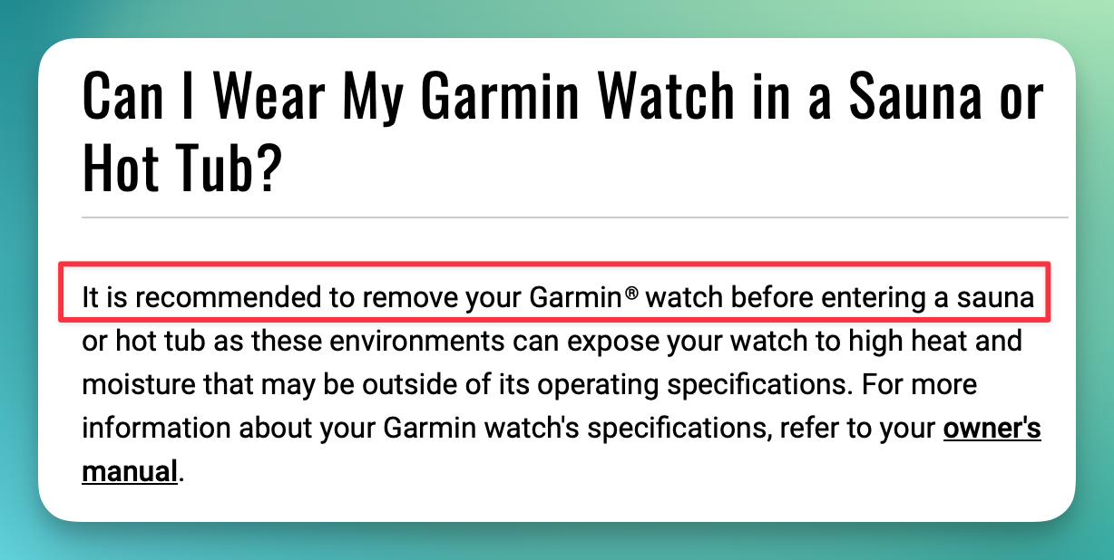 Nosit chytré hodinky, prsten nebo náramek do sauny není neobvyklé. Nejsem si jist, zda lidé, kteří tak činí, jsou si vědomi toho, že překračují limity zařízení o 35-55°C.