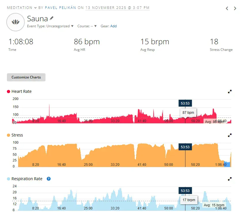 - Proč nízký průměr? Tři saunová sezení s ochlazením → HR kolísá mezi 60 bpm (chladící pauza) a 171 bpm (konec posledního sezení). Průměr 86 bpm je matematický výsledek.
