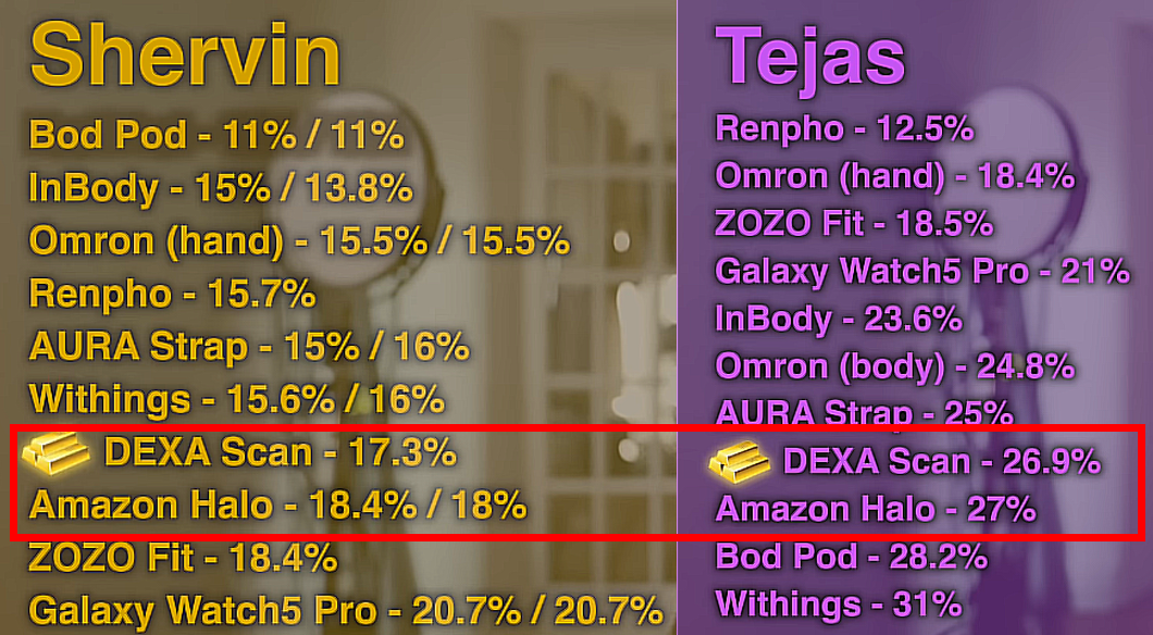 Co je Spren, k tomu se dostanu trochu oklikou. K testování Spren mě inspiroval Youtuber Shervin Shares, který se svým přítelem Tejasem v jednom ze svých videí testuje různá zařízení/metody analýzy těla. Jedním ze závěrů je, že hodnoty velmi blízké zlatému standardu DEXA, dává mobilní aplikace Amazon Halo.