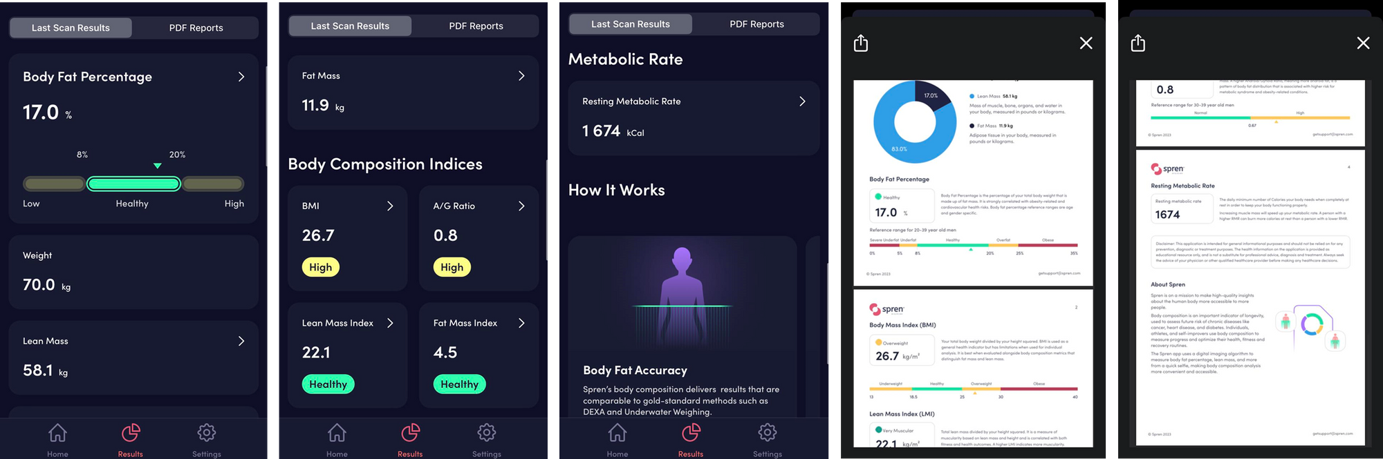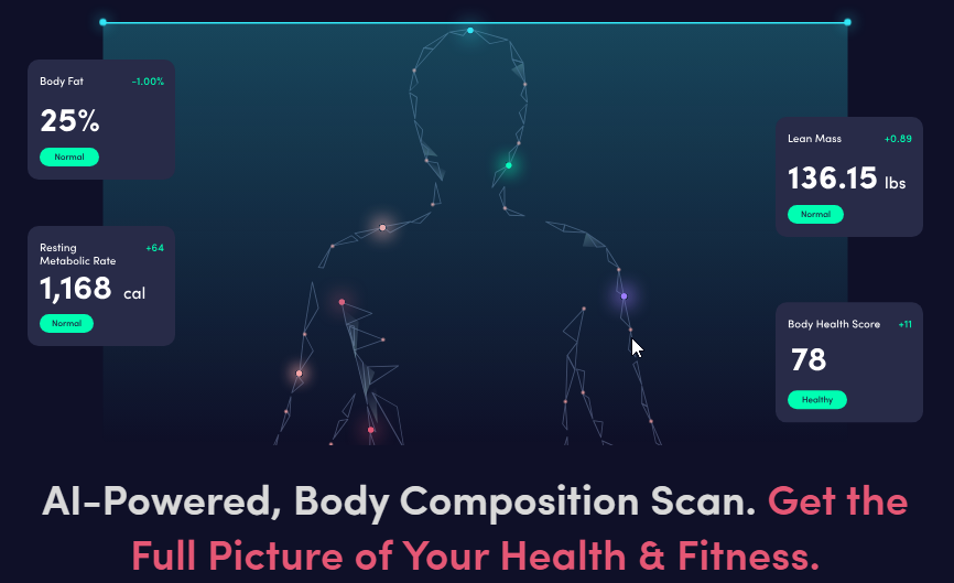 Samotné skenování kamerou je intuitivní a aplikace vás anglicky zvukově a také vizuálně instruuje. Jsou pořízeny 2 fotky, čelní a boční. Následně prožene fotky a vstupní data algoritmem strojového učení a voilà - report analýzy složení těla je na světě. Lze si jej prohlédnout ve formě dat v aplikaci, případně stáhnout v předpřipraveném pdf.