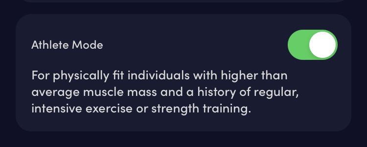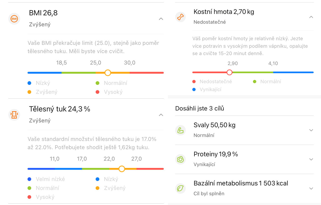 - V prvním jsem se dostal na vysvědčení tučných 22,6 % - ale neměl jsem aktivní v profilu "athlete mode", po konzultaci se zákaznickou podporou jsem jej aktivoval.