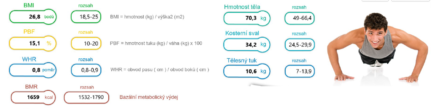 | Tělesný tuk | 17 % | 15,1 % | 24,3 % |