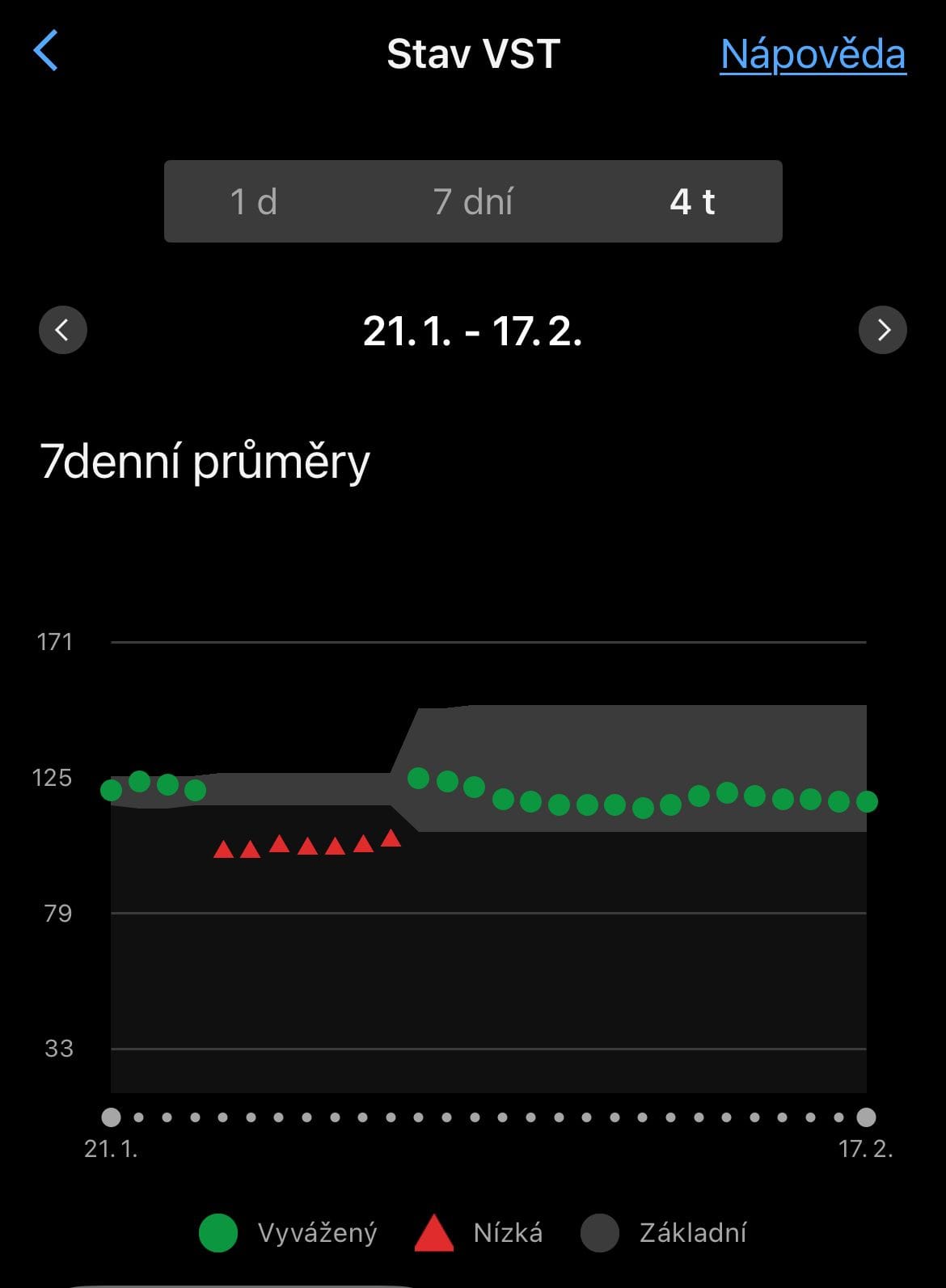 Tady je to černé na bílém. Noční průměr spadl ze 125 ms na 33 ms. Celý týden trvá, než je VST opět vyvážené. Zdroj: Garmin Connect autora.