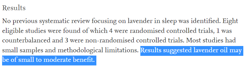 Levandule je známá svou charakteristickou vůní a jsou jí opět přisuzovány zklidňující účinky. Pokud nahlédneme pod pokličku meta-analýz, zjistíme, že stávající studie lze interpretovat v duchu "Výsledky naznačují, že levandulový olej může mít malý až střední přínos pro spánek" jako v případě této meta-analýzy [2]: