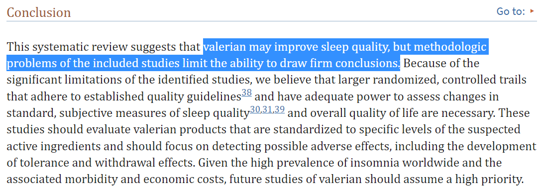 Pokud nahlédneme do studií a meta-analýz, dostaneme se sféry podobných výsledků jako v případě kanabinoidů. Tedy, že "kozlík může zlepšit kvalitu spánku, ale nelze vyvodit jednoznačné závěry" - jako např. v této meta-analýze [1]: