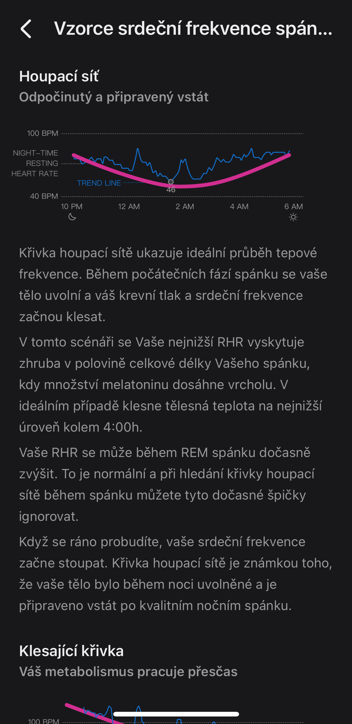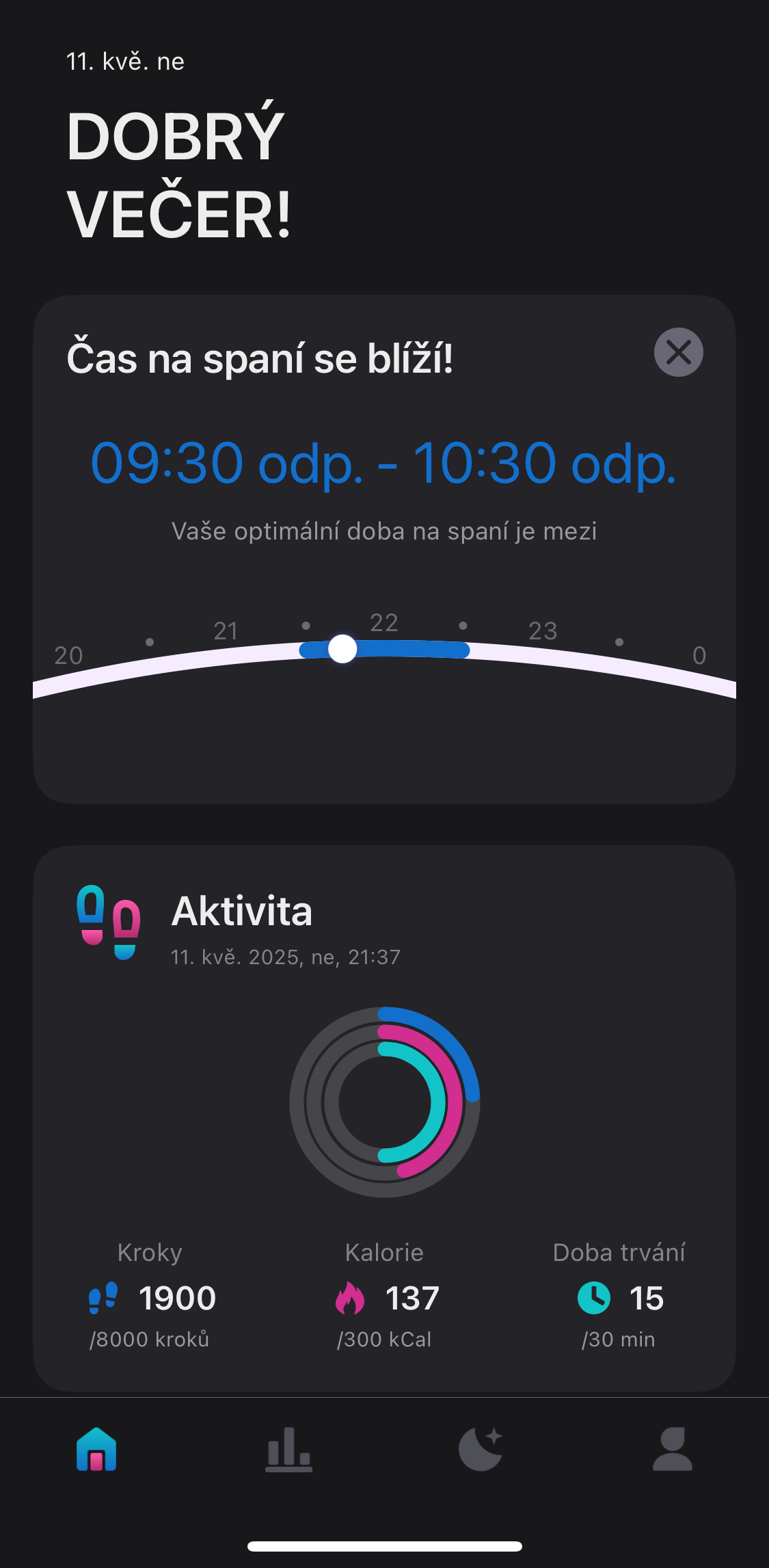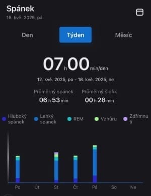 - 🌙 Spánek – spánková záložka podobné struktury jako ta co se zaměřuje na aktivity. Zde lze najít údaje skóre kvality spánku, poměr spánku (spánkové fáze), průměrná tepová frekvence při spánku, biologické hodiny (funkcionalita podobná Chronotypu u Oury). Aplikace zde zobrazuje i průměrnou hodnotu HRV, odchylku tělesné teploty a také hladinu kyslíku v krvi během noci, pokud je funkce aktivní.