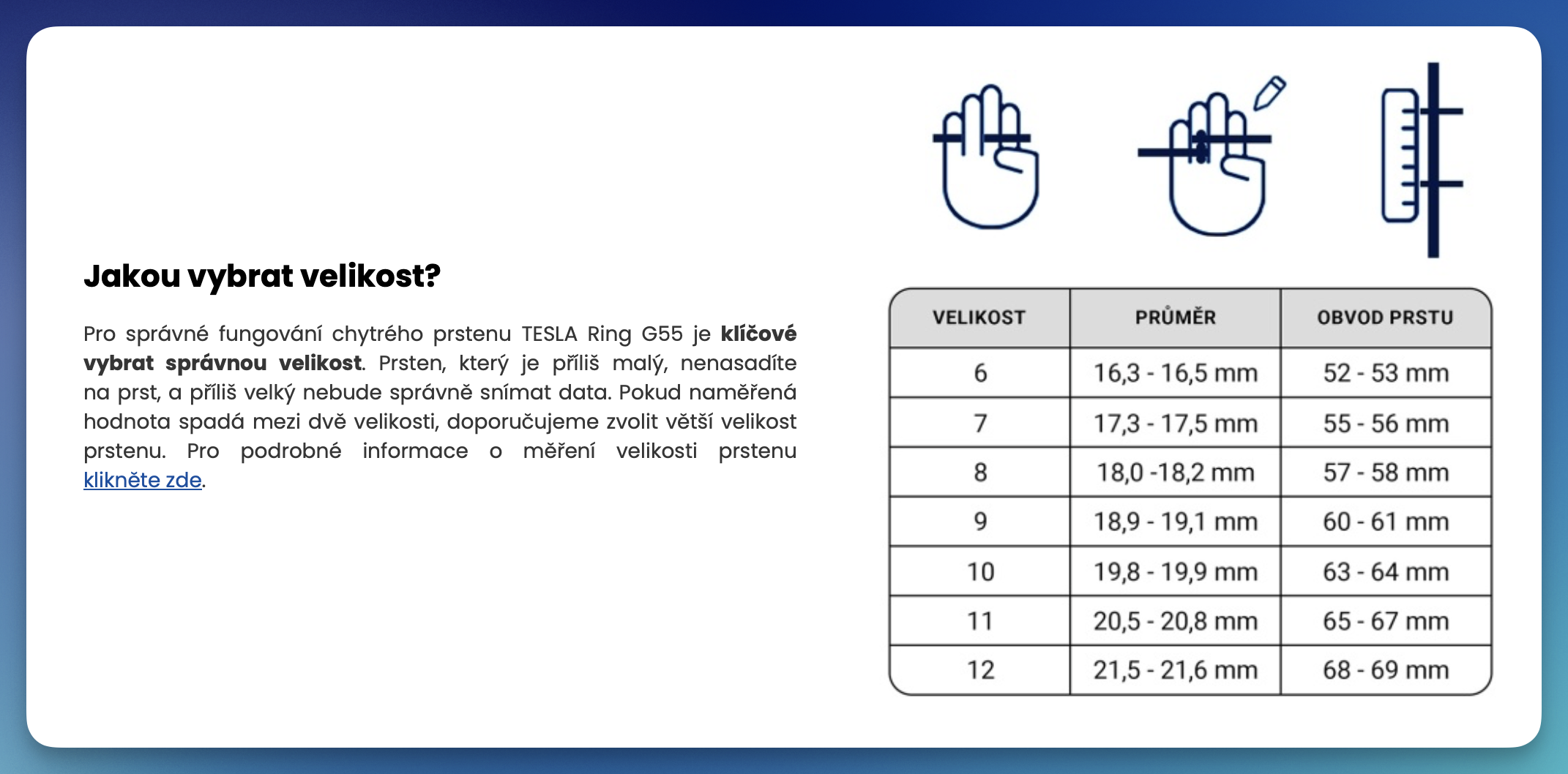 Levnější prsteny – včetně TESLA Ring G55 – pracují s měřením obvodu prstu a následnou převodní tabulkou: