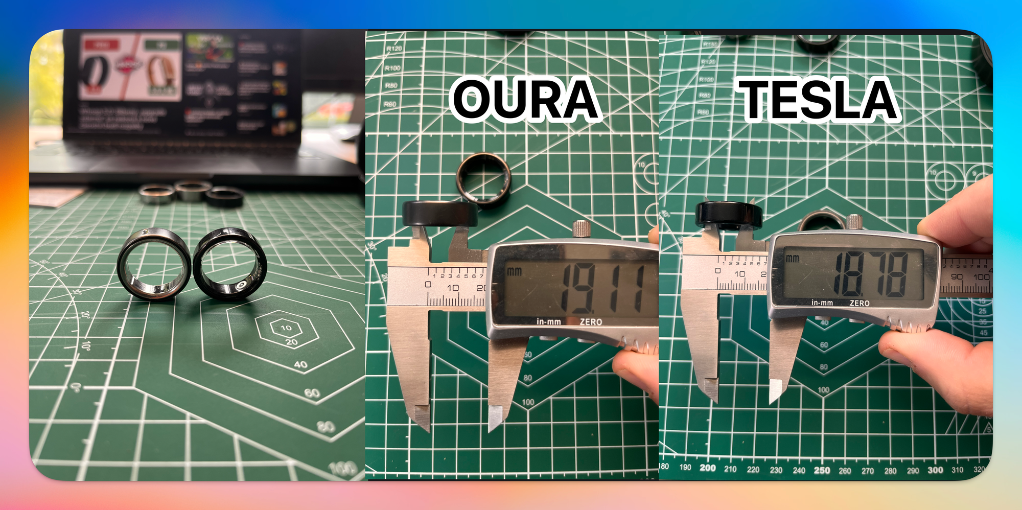 Mimochodem, velikosti prstenů nejsou napříč značkami shodné. Například velikost 9 u TESLA Ringu a velikost 9 u Oura Ring 4 se liší ve vnitřním průměru následovně: