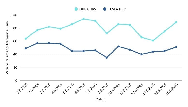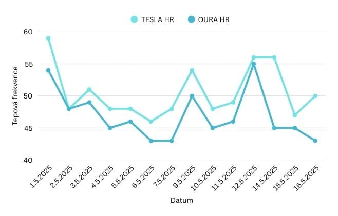 Ano, porovnávám prsten, který stojí jen zlomek ceny Oury (a to ani nepočítám předplatné). Přesto bych u průměrného srdečního tepu (HR) očekával maximálně pár úderů za minutu rozdílu. TESLA prsten má tendenci hodnoty mírně nadhodnocovat – průměrná odchylka je 3,5 bpm. Korelace mezi oběma zařízeními dosahuje hodnoty 0,76, což značí silnou shodu v trendu.