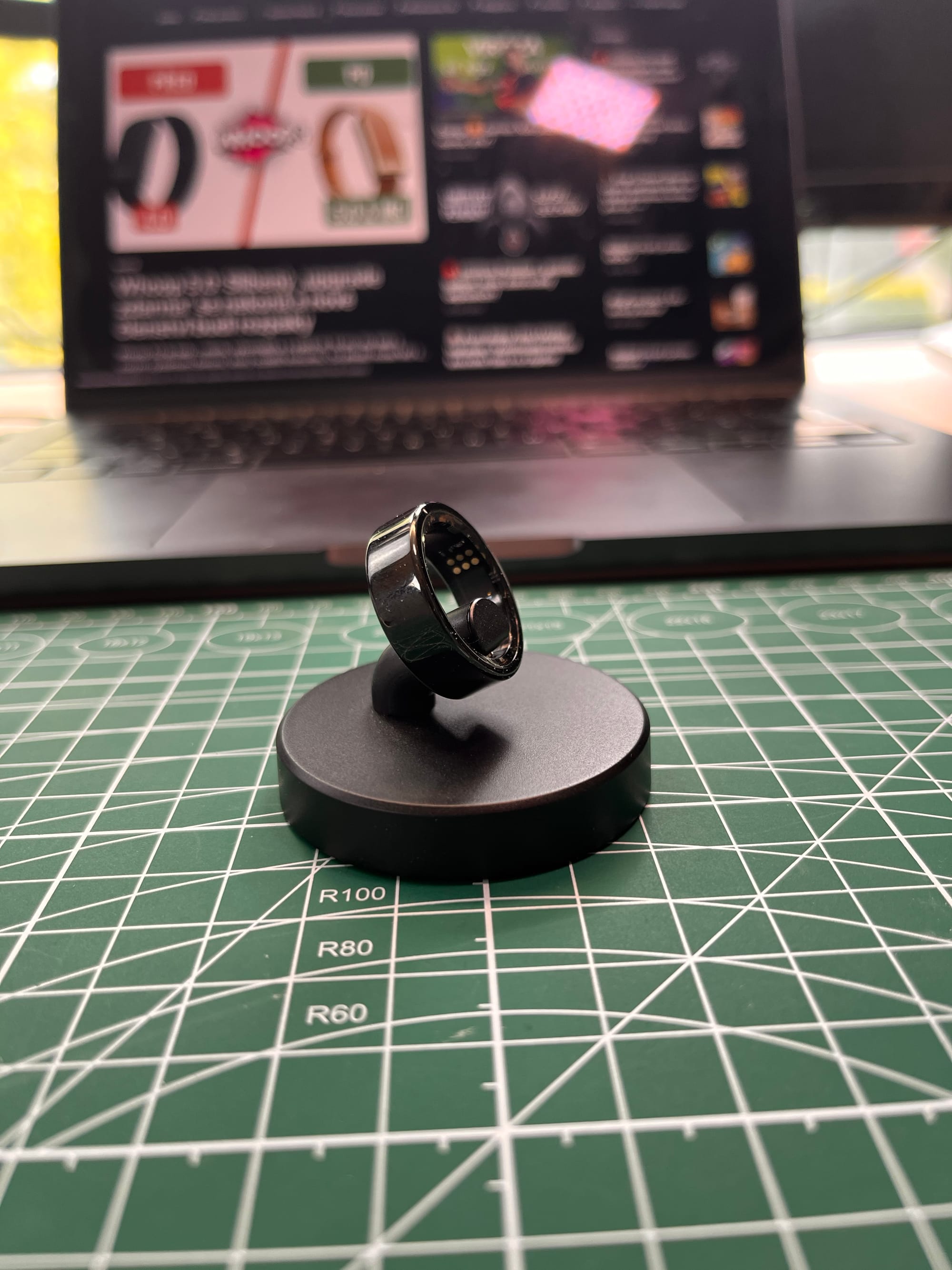 Za poměrně vkusný považuji nabíjecí stojánek, který pomocí magnetu a jediného pogo pinu na své straně spolehlivě přichytí prsten ke kontaktu umístěnému na vnitřní straně prstenu. Nabíjení tak probíhá automaticky a bez nutnosti přesného zarovnávání.