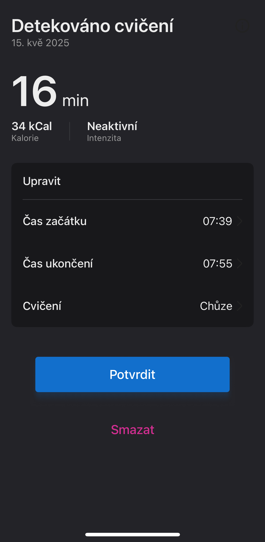 - Záznamy o cvičení – cvičení iniciovaná uživatelem