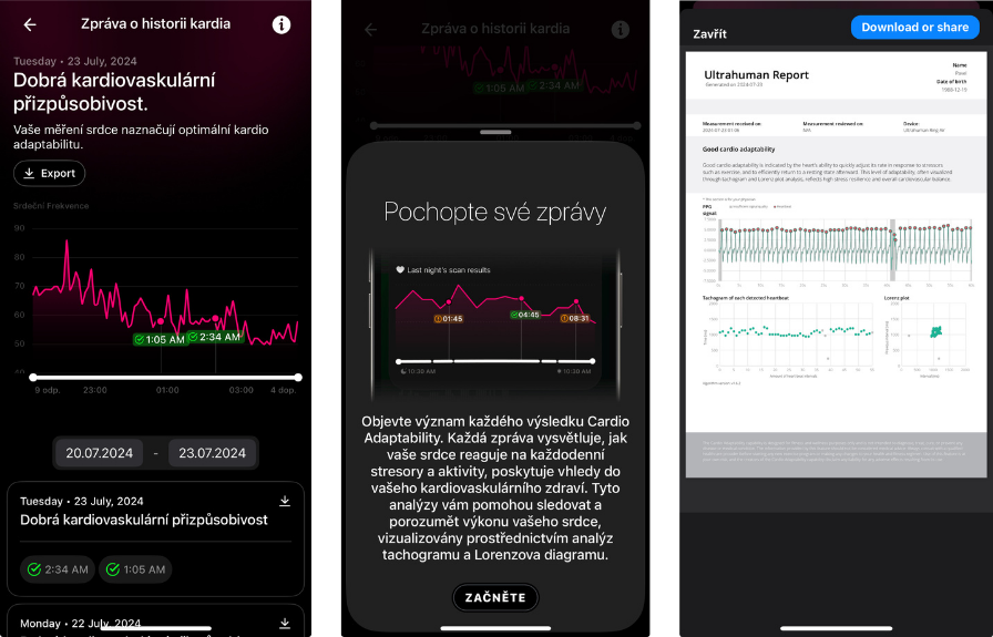 K dispozici je aktuálně kardiovaskulární adaptibilita, kterou jsem otestoval (první 3 dny 🆓, následně 2,9 💶/měsíc). Měření probíhá v noci. První noc se měření nezdařilo – nevěděl jsem totiž, že musím mít v blízkosti prstenu telefon. Další 2 noci už proběhly v pořádku. Pro analýzu používá tachogramy a Lorenzovy grafy: