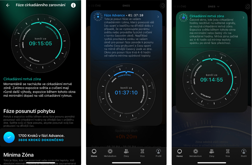 Podobně jako u kofeinu, jde o nástroj, který je již dlouho součástí aplikace Ultrahuman. Radí vám, jaké činy (cvičení, vystavení se světlu atd.) mají vliv na vaše cirkadiánní rytmy podle toho, v jaké fázi jste. V podstatě jde o fázi ráno - během dne a večer.