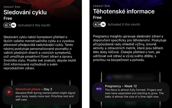 Sledování cyklu je PP, který ženám umožňuje monitorovat jejich menstruační cyklus a poskytuje jim personalizovaná doporučení pro danou fázi. PP Těhotenské informace poskytuje doporučení pro každý trimestr s ohledem na naměřené metriky (HR, HRV, RHR).