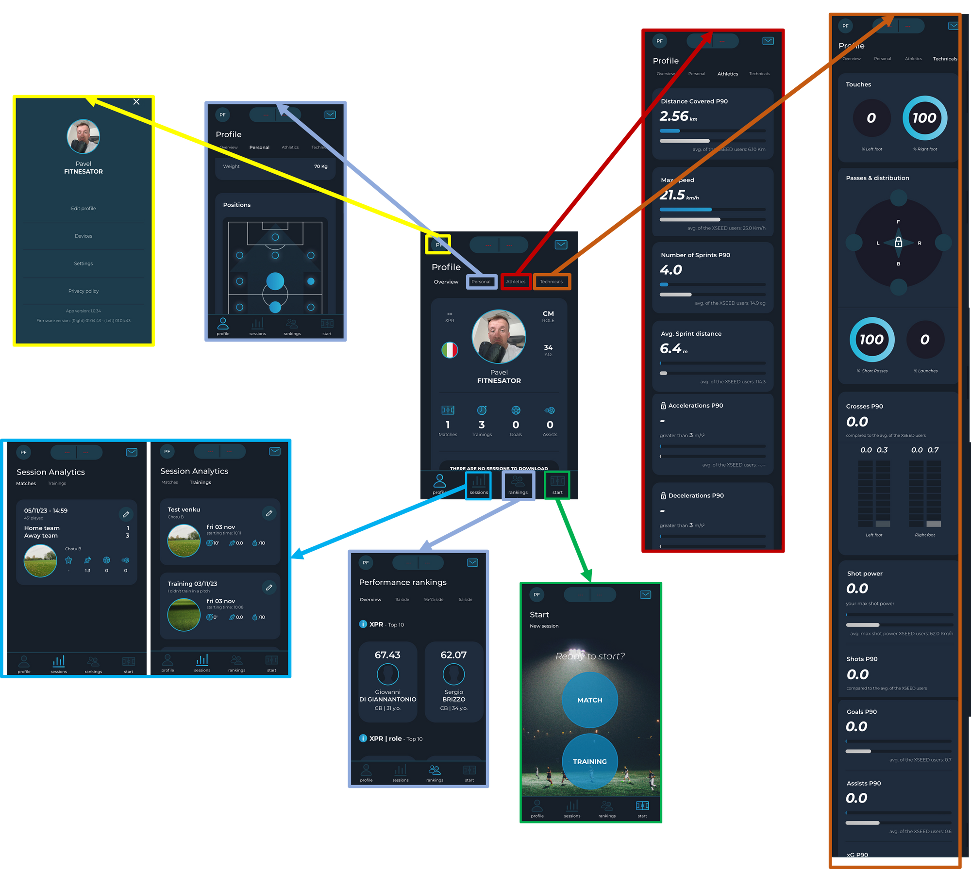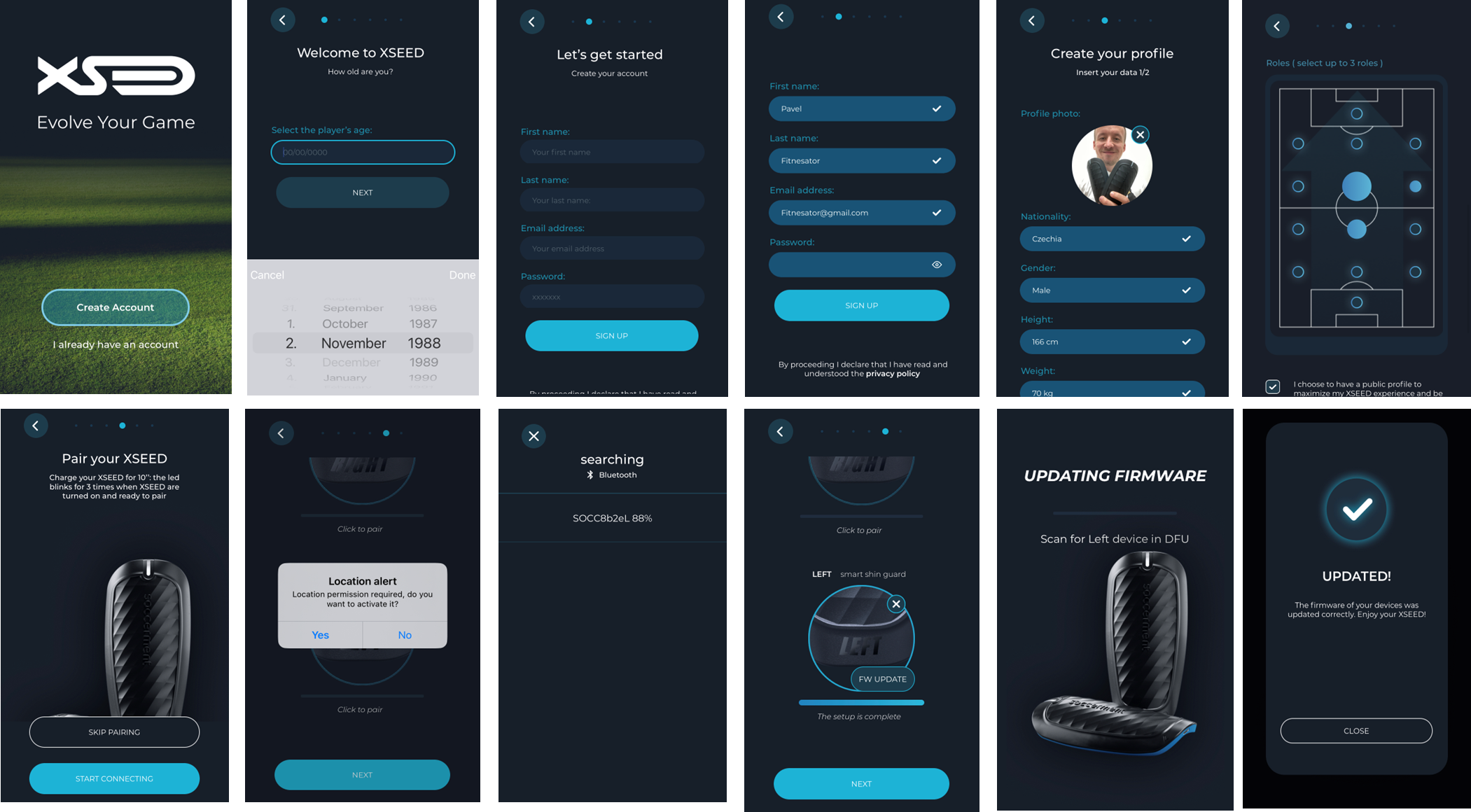 Nedílnou součástí většiny wearables je samozřejmě mobilní aplikace - v tomto případě aplikace XSEED, která slouží pro vytvoření účtu, spárování, nastavení, updaty firmware, inicializaci (tj. spuštění sessions: zápas/trénink) a hlavně pro následnou vizualizaci dat.
